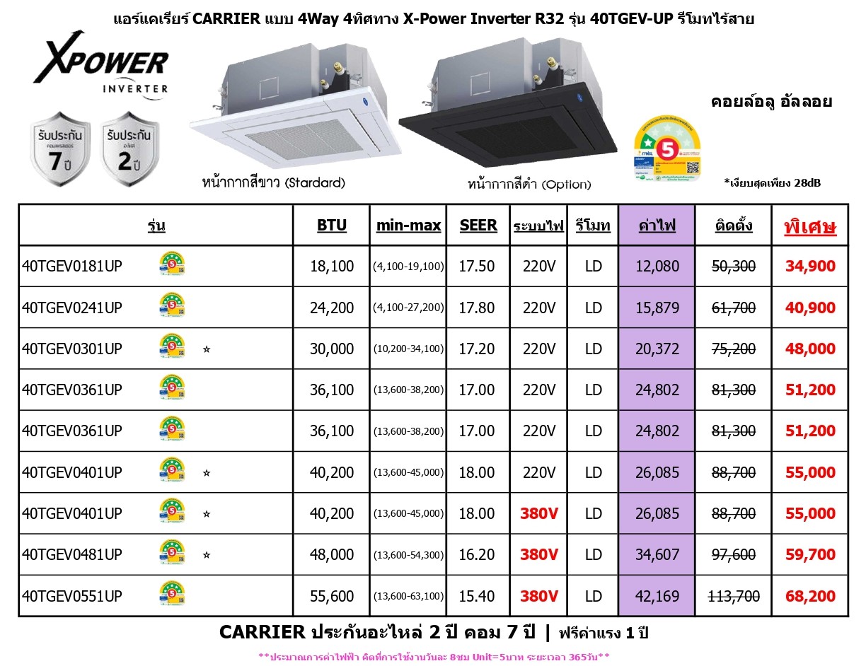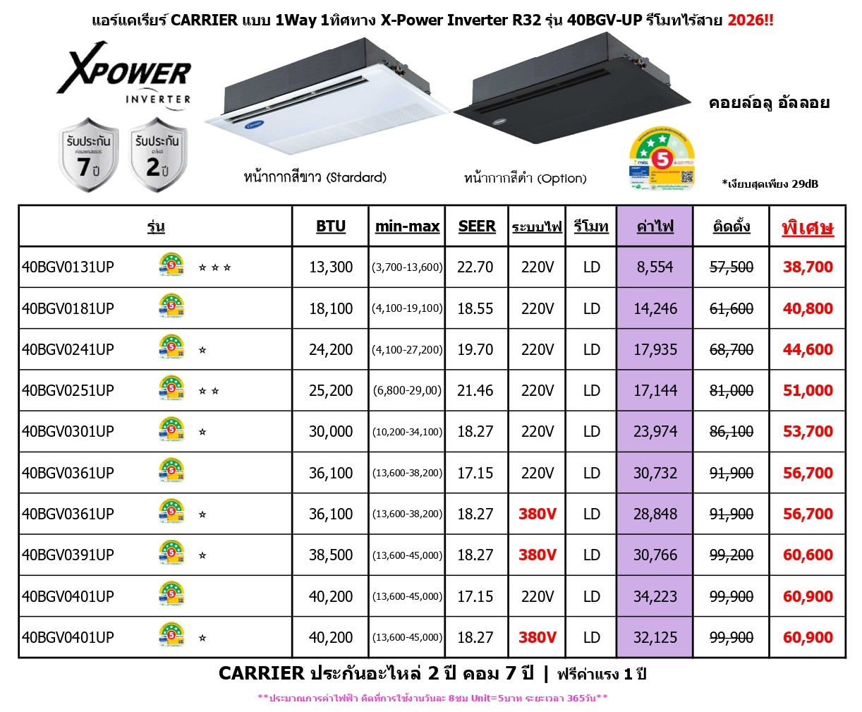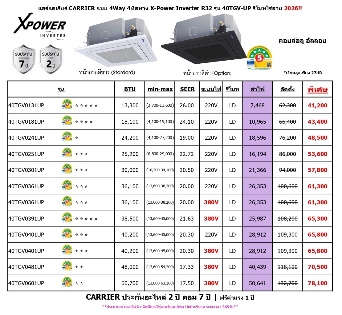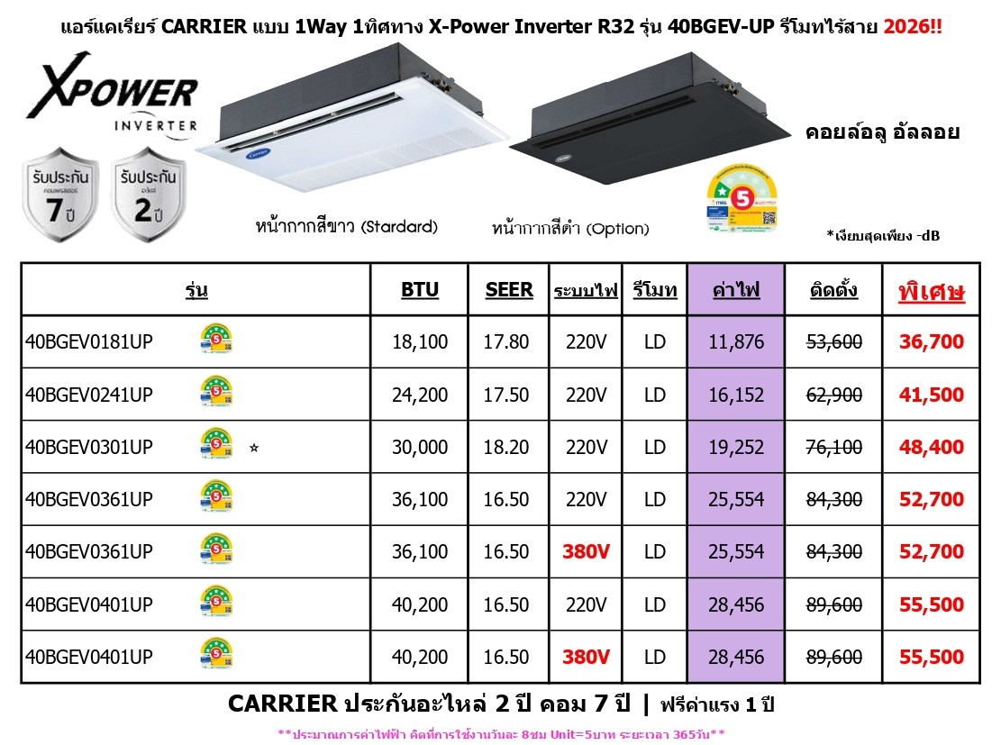 CARRIER ประกันอะไหล่ 2 ปี คอม 7 ปี | ฟรีค่าแรง 1 ปี