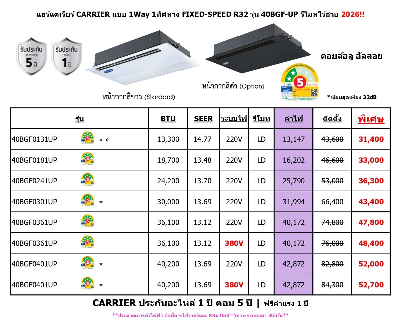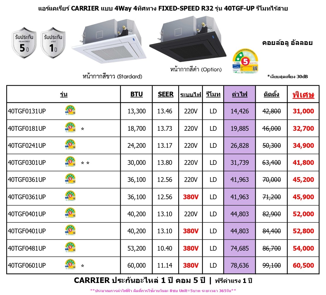 CARRIER ประกันอะไหล่ 1 ปี คอม 5 ปี | ฟรีค่าแรง 1 ปี