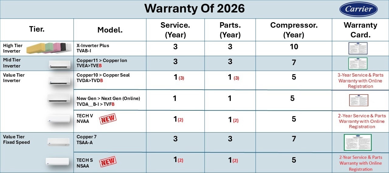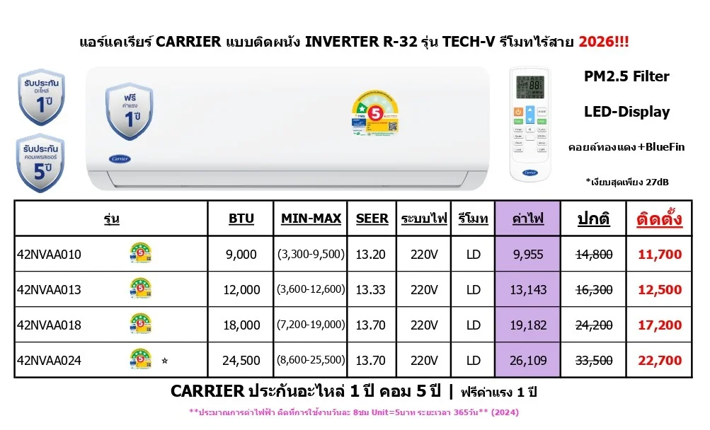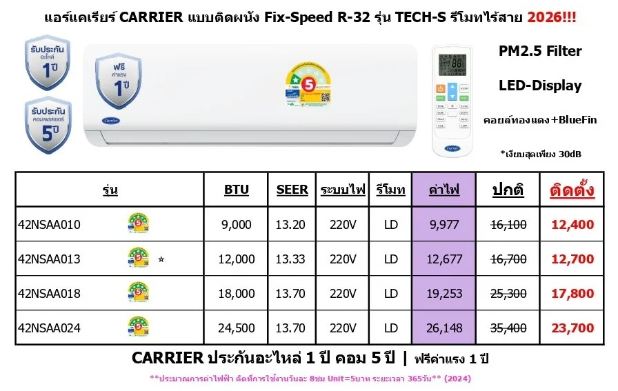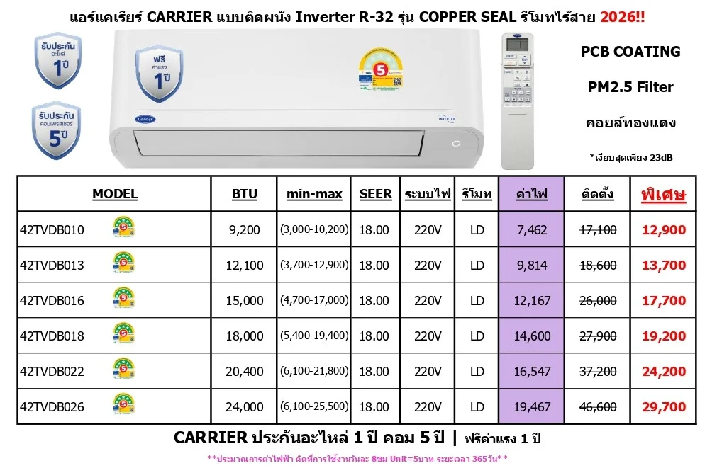 CARRIER ประกันอะไหล่ 1 ปี คอม 5 ปี / ฟรีค่าแรง 1 ปี
