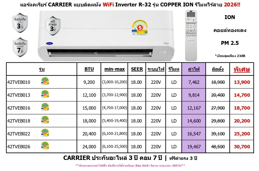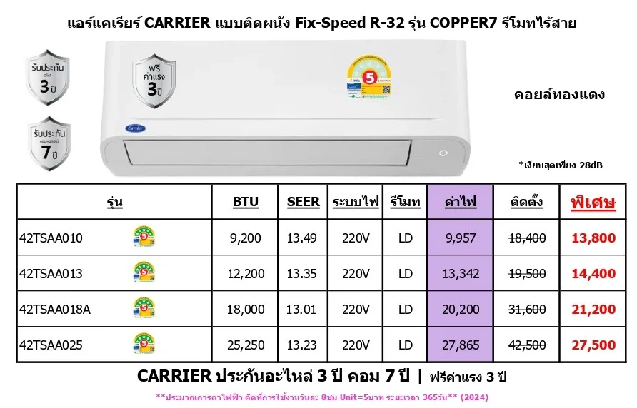 CARRIER ประกันอะไหล่ 3 ปี คอม 7 ปี / ฟรีค่าแรง 3 ปี