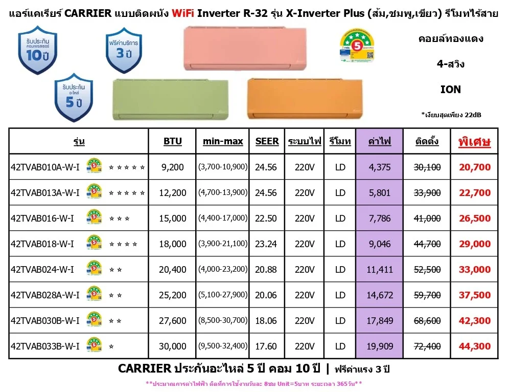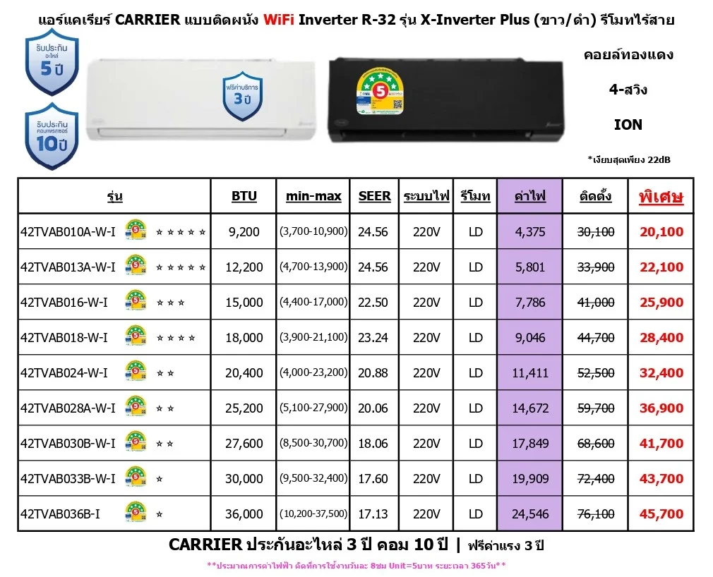 CARRIER ประกันอะไหล่ 5 ปี คอม 10 ปี / ฟรีค่าแรง 3 ปี