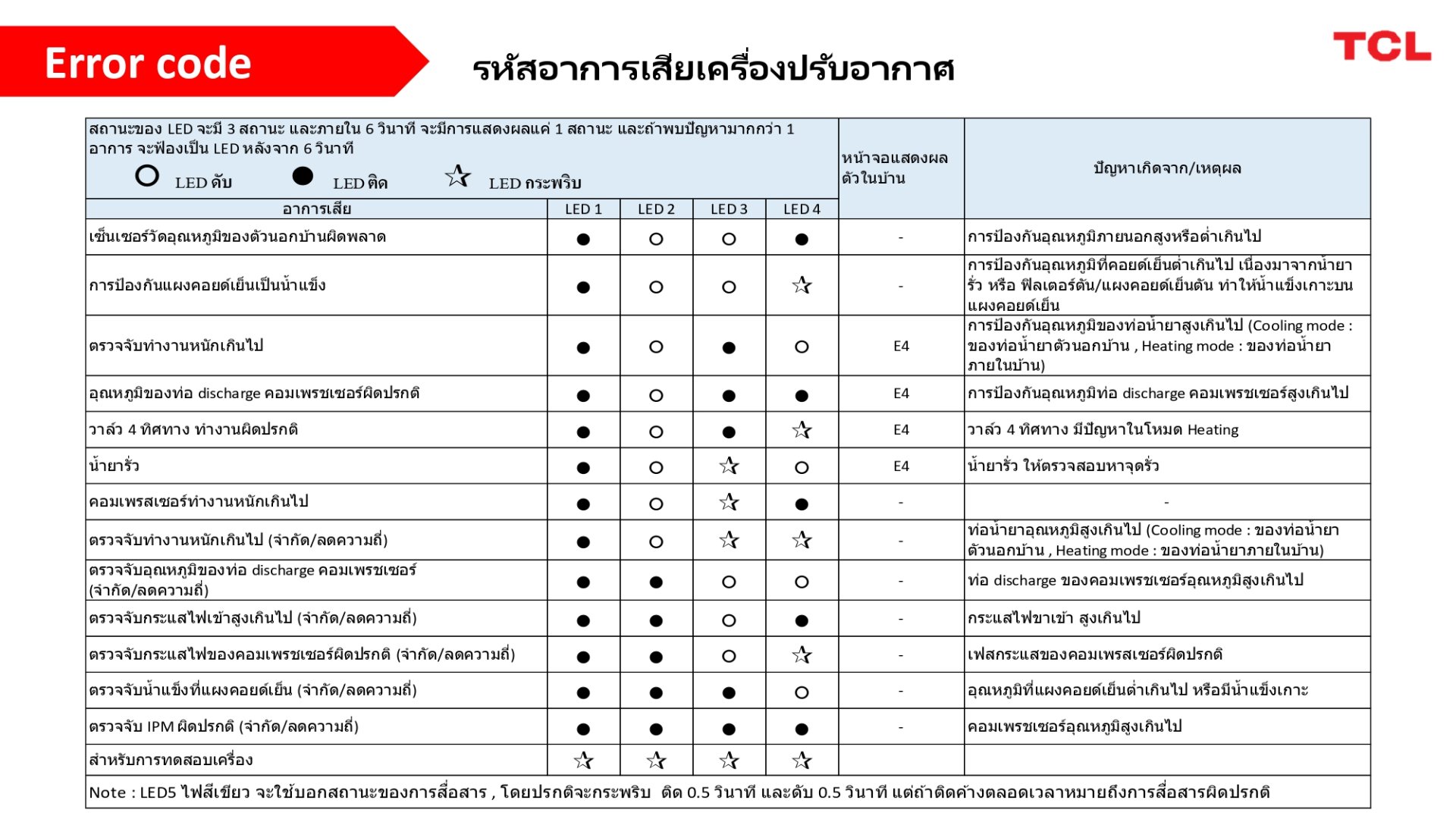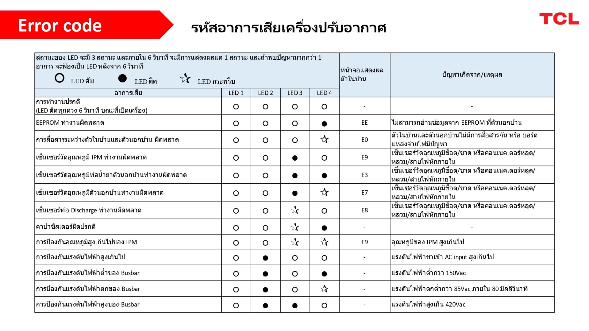 - ตาราง ERROR CODE แสดงความผิดปกติของเครื่องปรับอากาศทีซีแอลที่มา : สมาคมผู้ค้าเครื่องปรับอากาศไทย / TCL THAILAND