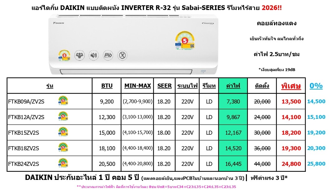 รุ่น MAX INVERTER Sabai Series FTKB-ZV2S R-32