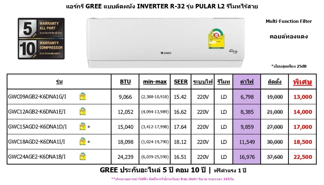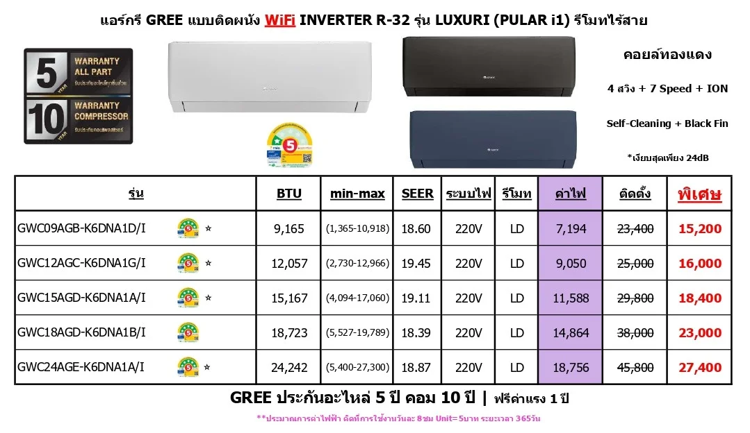 (รับประกันอะไหล่ 5 ปี คอม 10 ปี ฟรีค่าแรง 1 ปี)