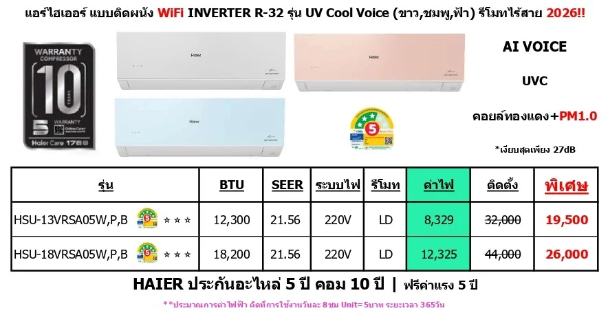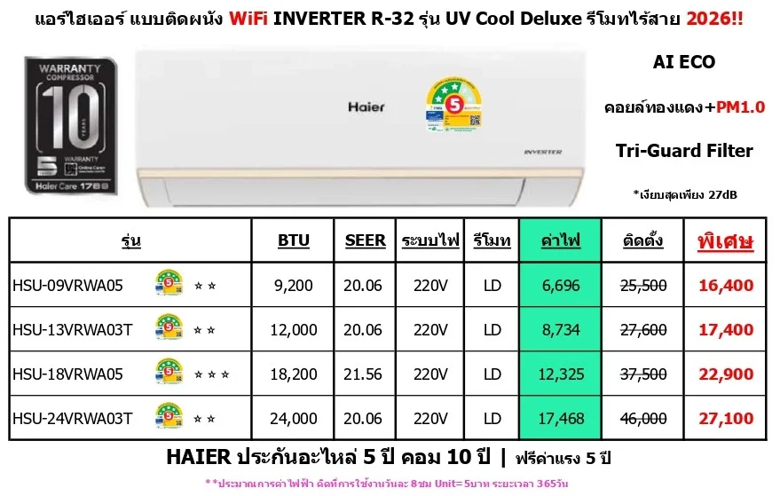 (รับประกันอะไหล่ 5 ปี คอม 10 ปี ฟรีค่าแรง 5 ปี)