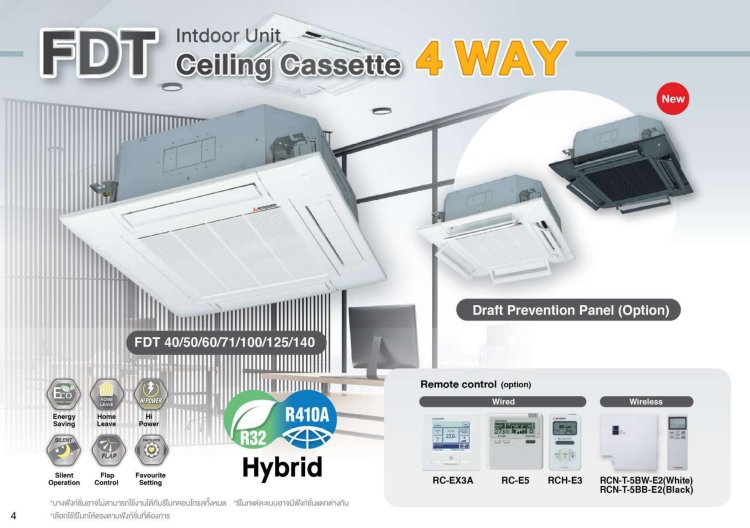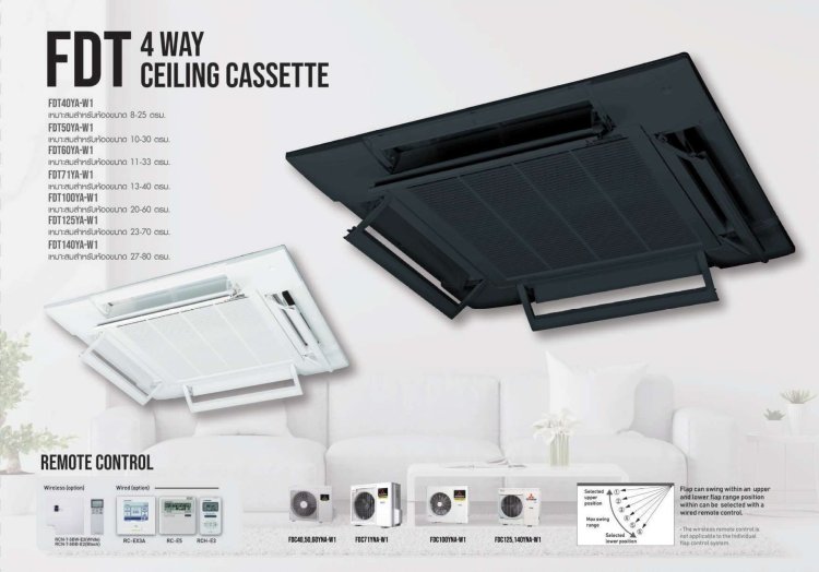 FDT ธรรมดา 4ทิศทาง ฝังฝ้าเพดาน รีโมทไร้สาย R-410a ระบบไฟ 220 } 380V