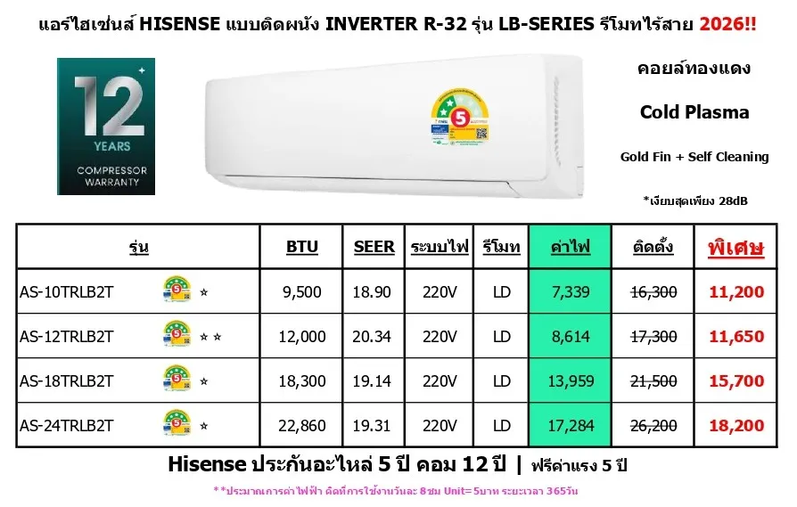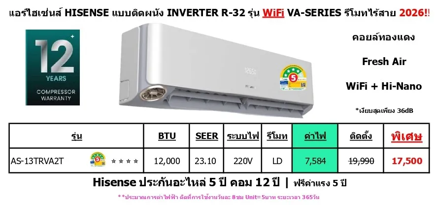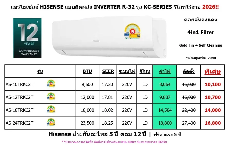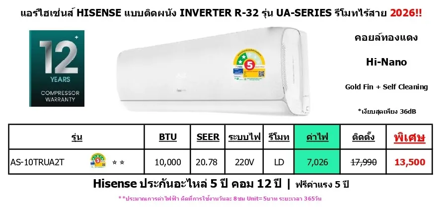 (รับประกันอะไหล่ 5 ปี คอม 12 ปี ฟรีค่าแรง 5 ปี)