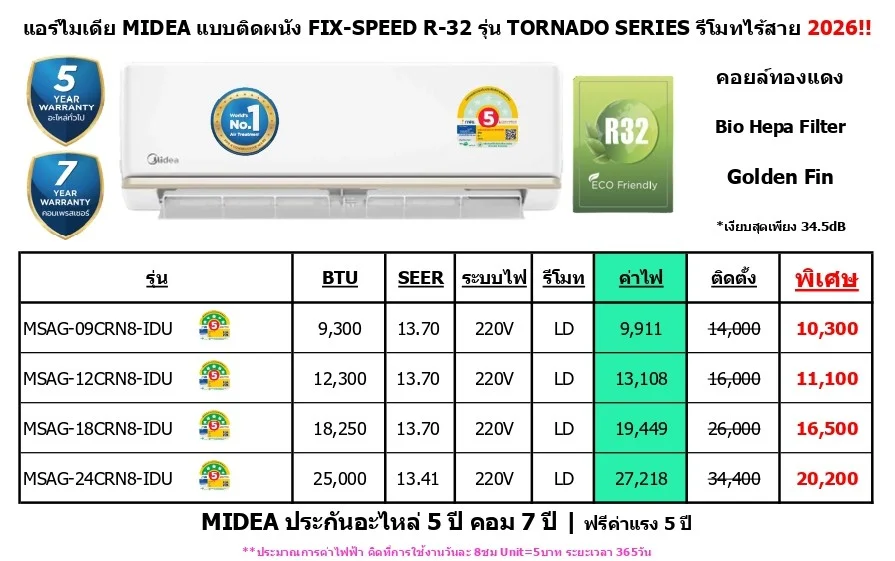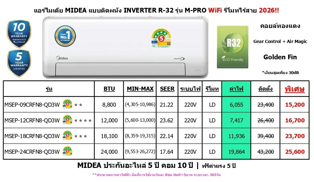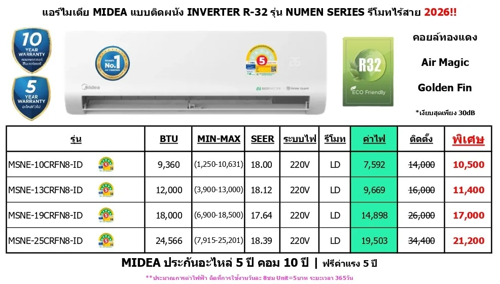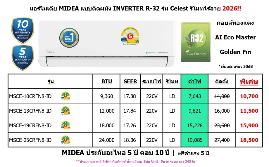 MIDEA ประกันอะไหล่ 5 ปี คอม 7 ปี / ฟรีค่าแรง 5 ปี
