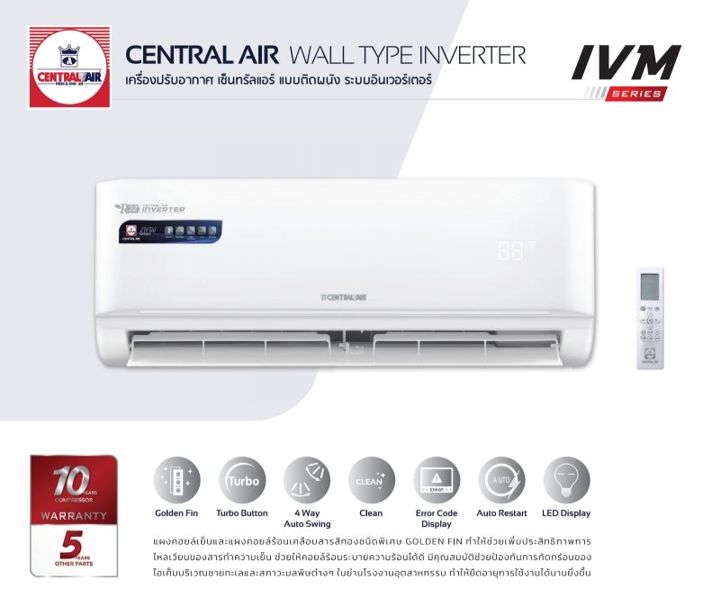 CENTRAL-AIR ประกันอะไหล่ 5 ปี คอม 10 ปี | ฟรีค่าแรง 1 ปี